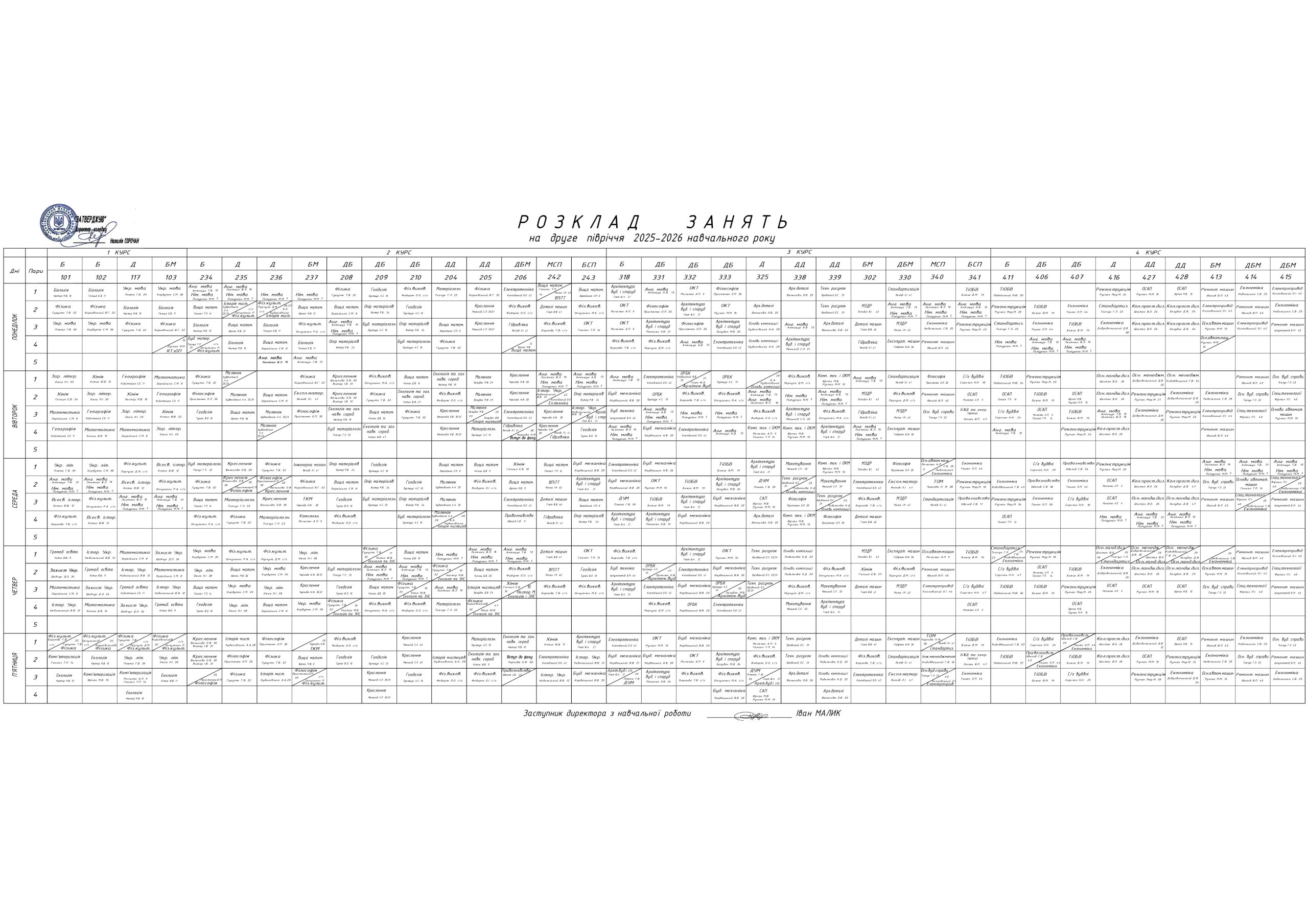 Розклад занять  на 2 семестр 2025-2026 навчального року